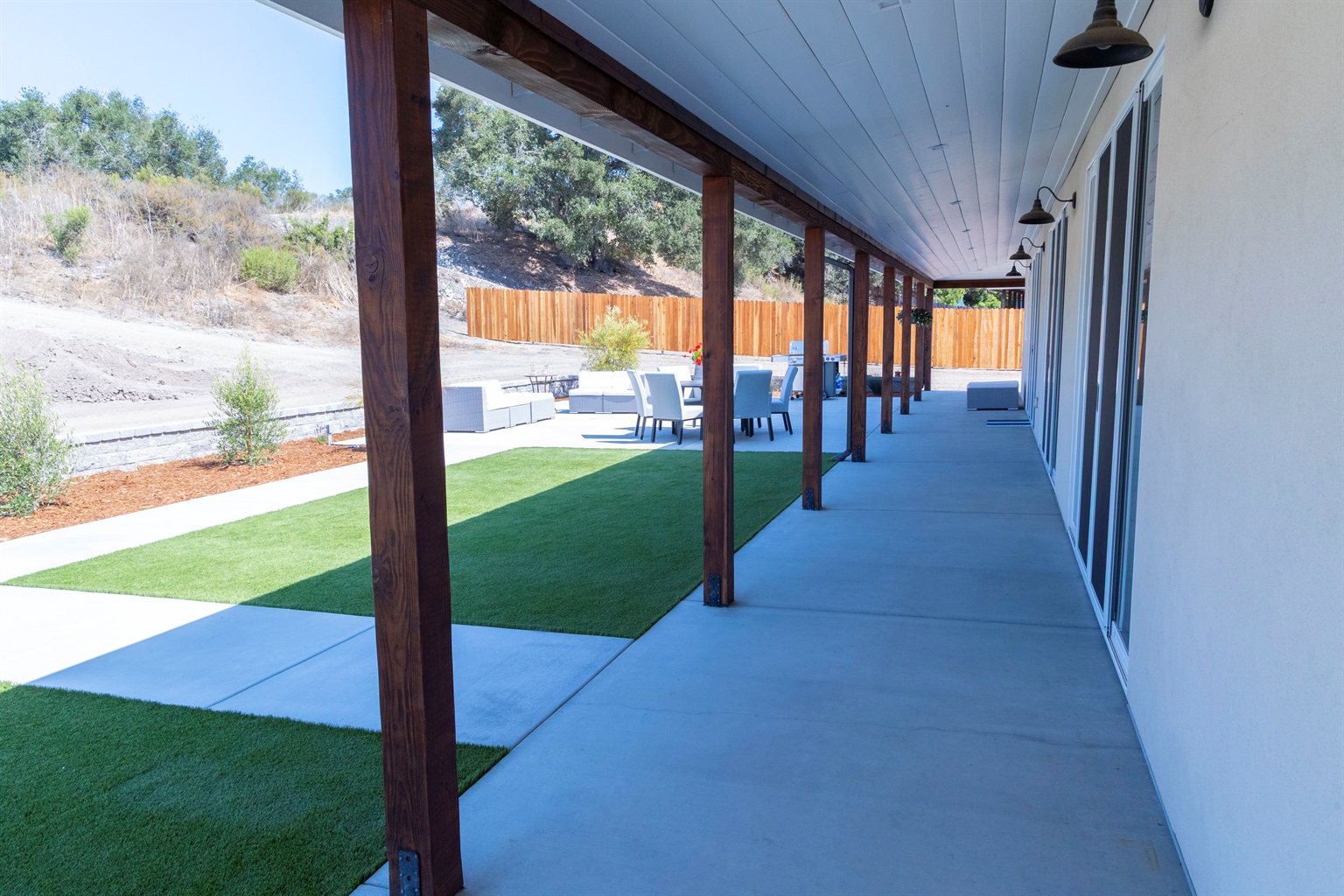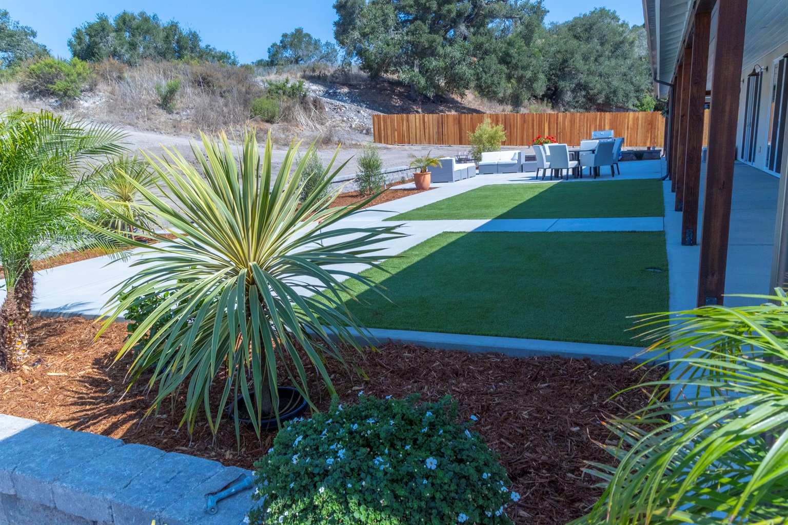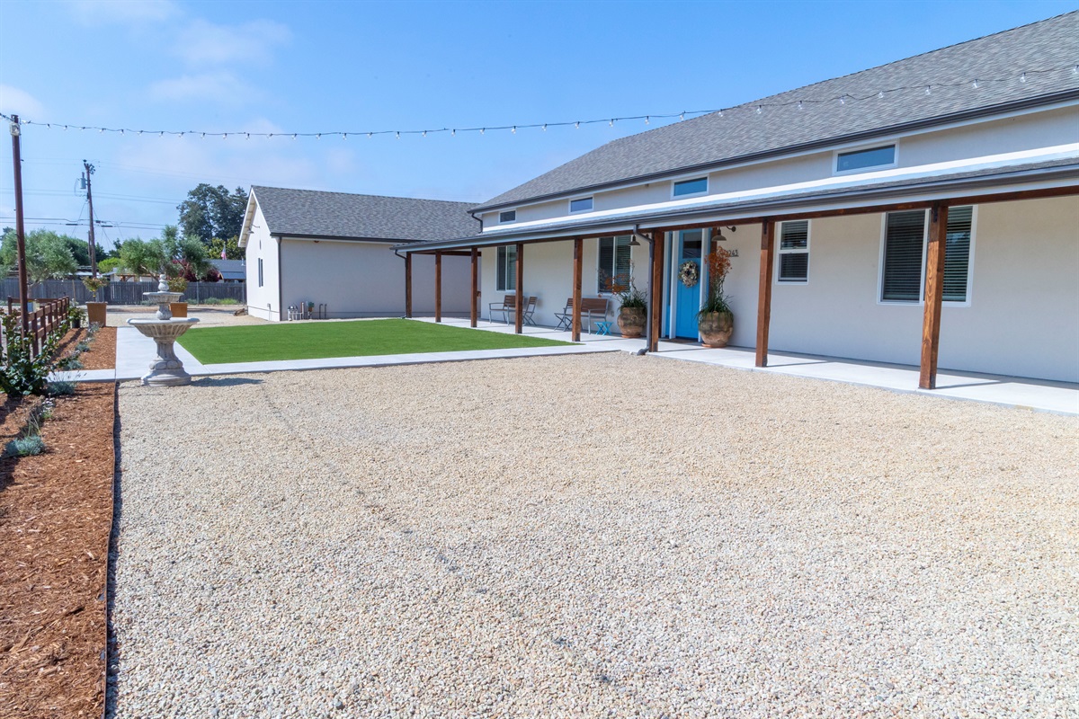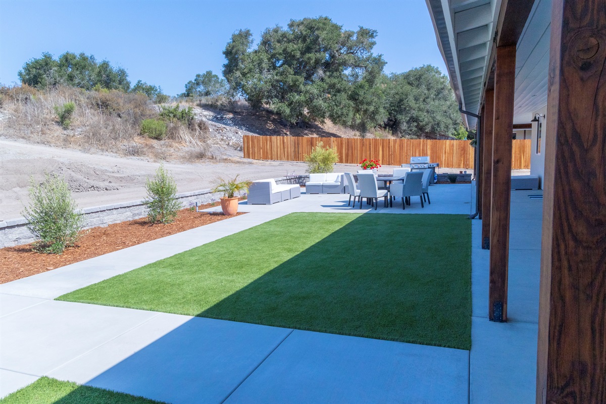 Front Yard: Features a large artificial grass area and a scenic rock patio with string lights, perfect for evening drinks overlooking the farm fields.