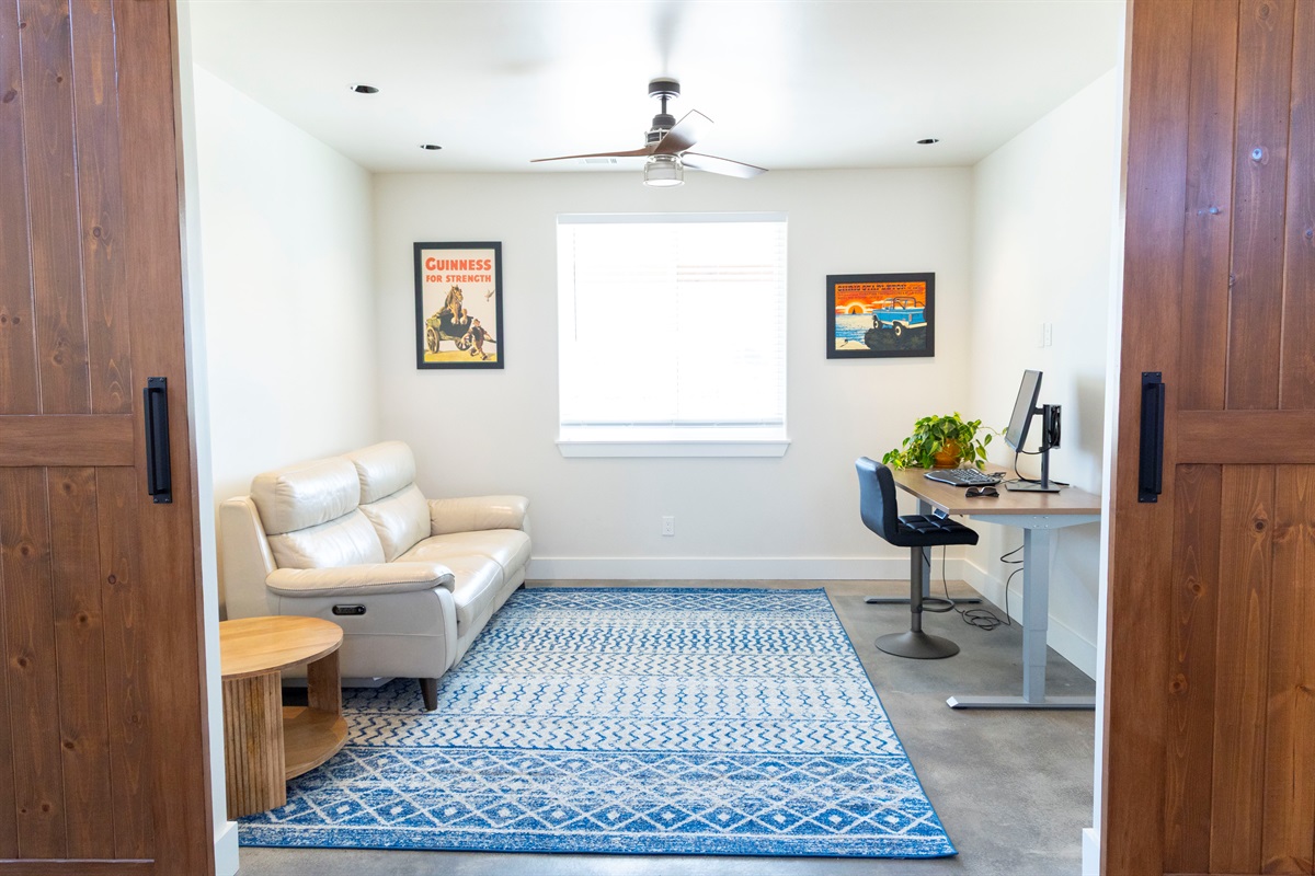Work-from-Home: A dedicated bonus room equipped with a desk, monitor, keyboard, and a reclining couch for comfortable remote work.