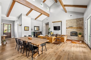 Our newly-built farmhouse with wood-beamed, vaulted ceilings features everything you need for a perfect getaway! Whip up your meals in a fully-outfitted, gourmet kitchen with a double oven, built-in microwave and Keurig. Both indoor and outdoor dining areas have extra long tables with seating and settings (i.e., dishes, silverware, etc.) for 10+ people. The open concept great room with smart TV connects directly to the spacious backyard with a hot tub, horseshoe pit, corn-hole and gas BBQ grill. Inside you’ll find more fun in the garage where we have another smart TV, ping-pong, foosball and floor-to-ceiling shelving stacked with board games. Two en-suites and one shared bath, all with shower and tub, plus a half-bath in the main living area make sharing space a breeze. The house has 2 nest systems to operate the AC and heat, keeping you comfortable any time of year.