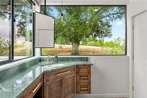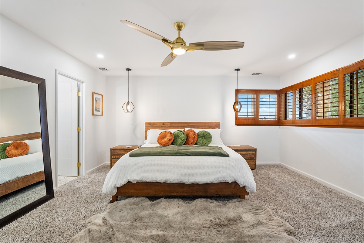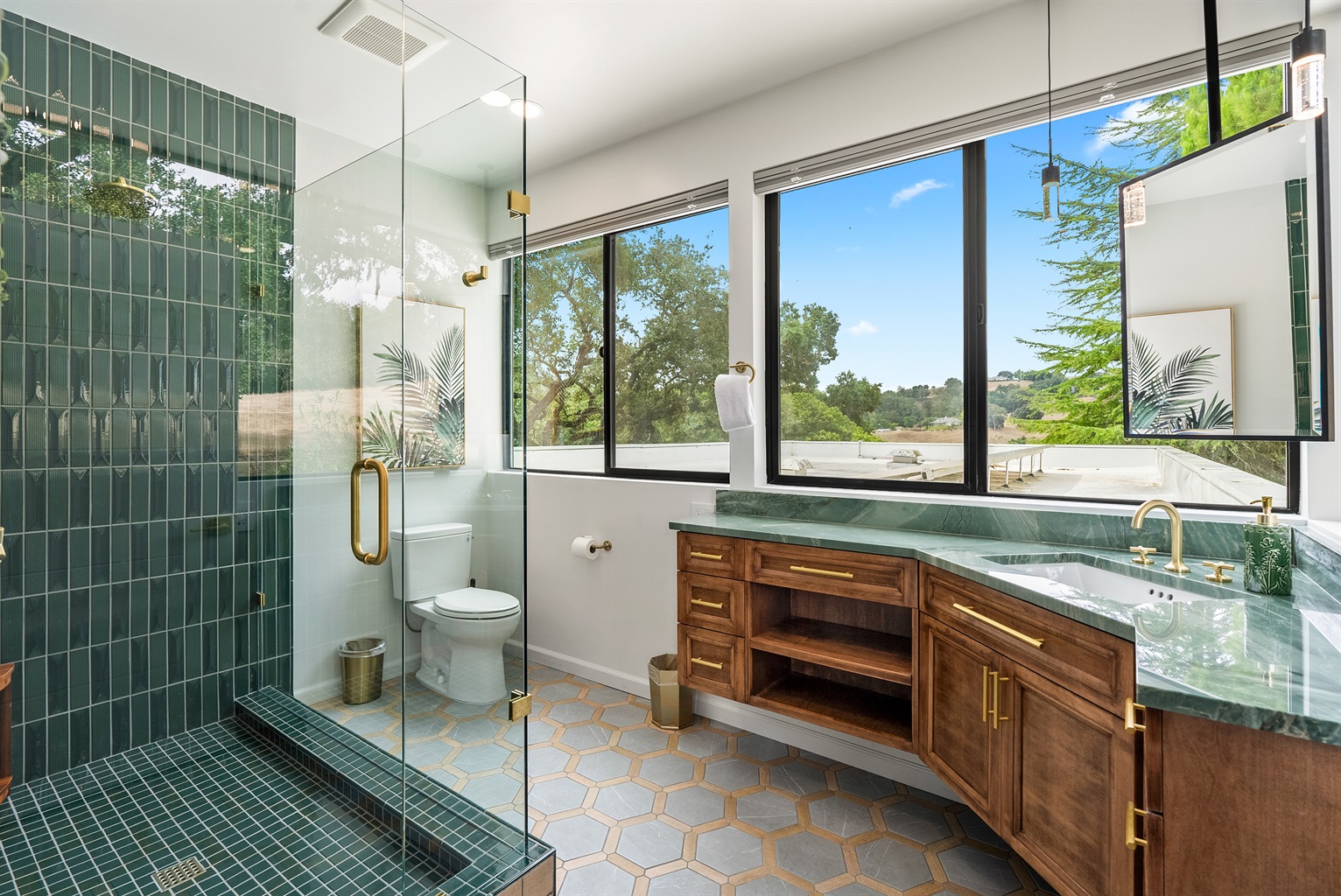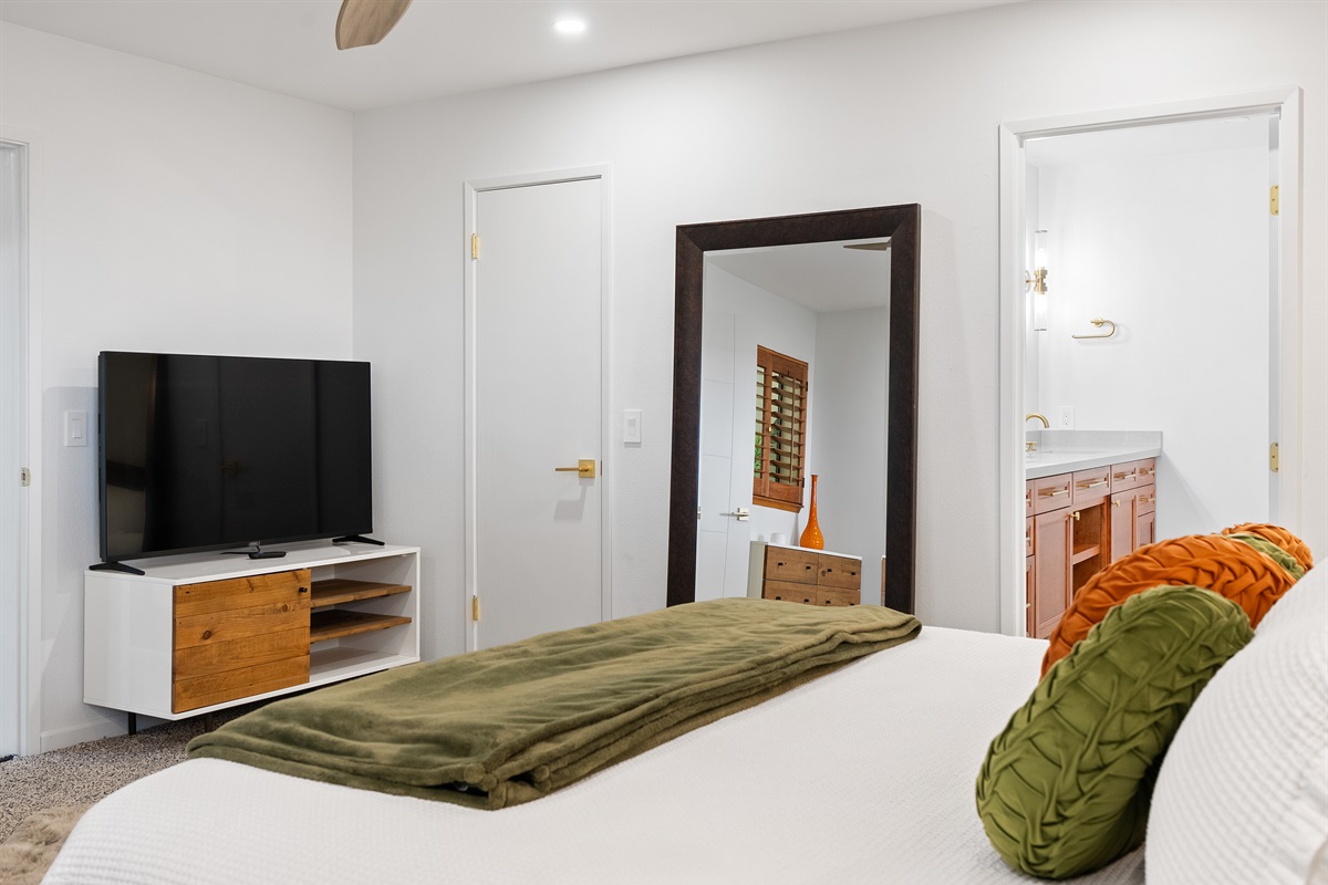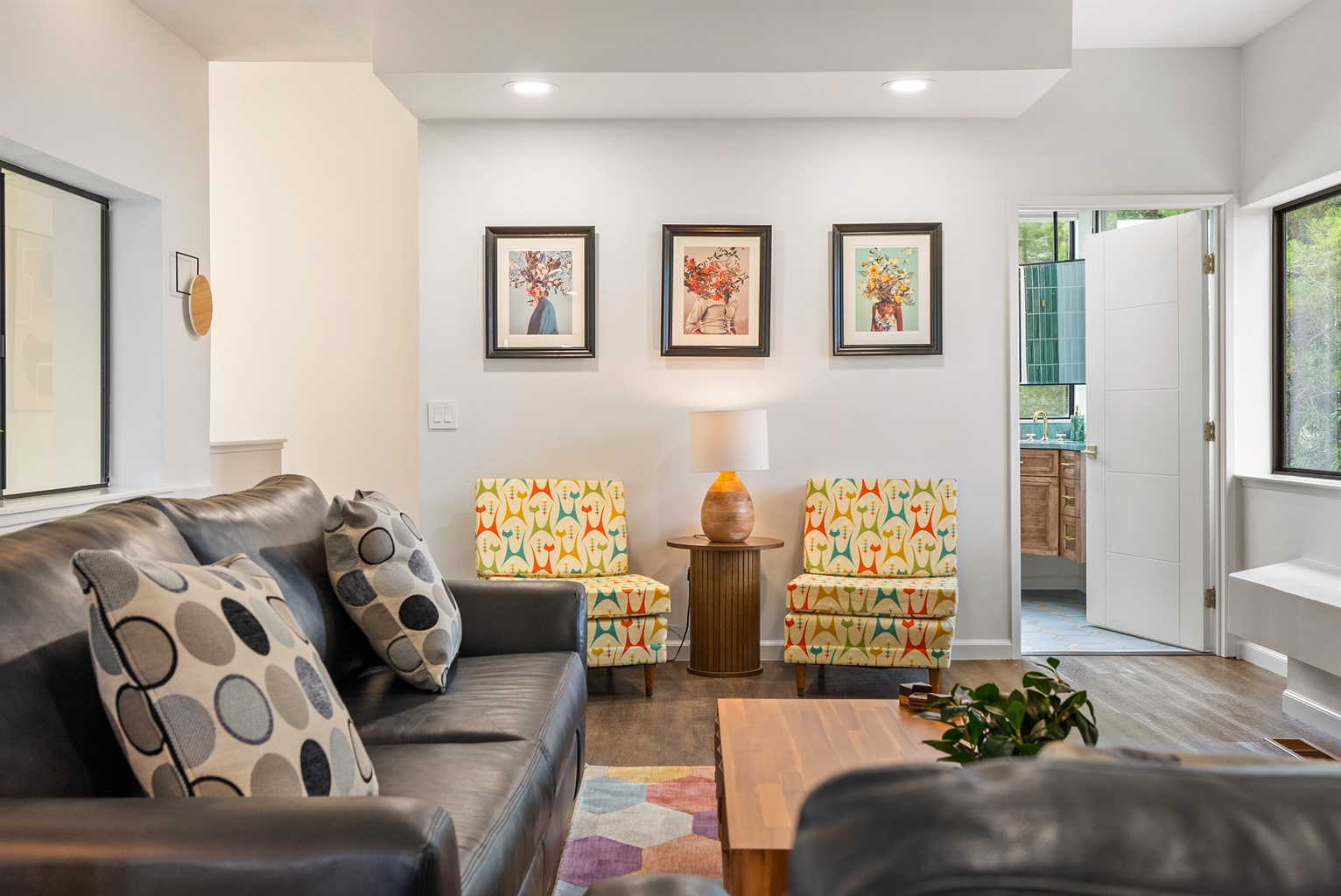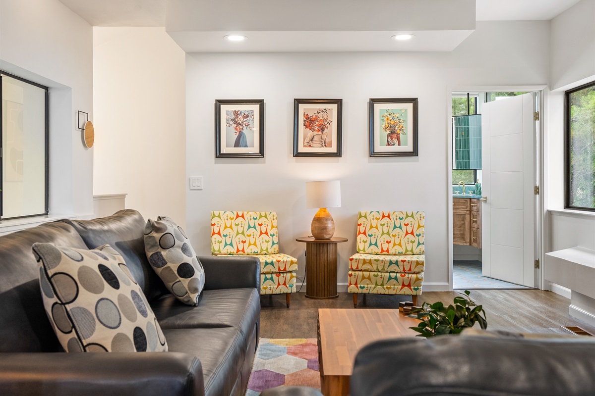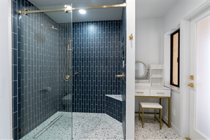 Additionally, the Green with Envy upstairs full bathroom has been completely renovated with a stunning walk-in shower. Take a refreshing shower in our “Green with Envy” space, designed to let you feel at one with the outdoors. The design perfectly complements the home's mid-century modern vibe and is conveniently located near the main living area for guest use.