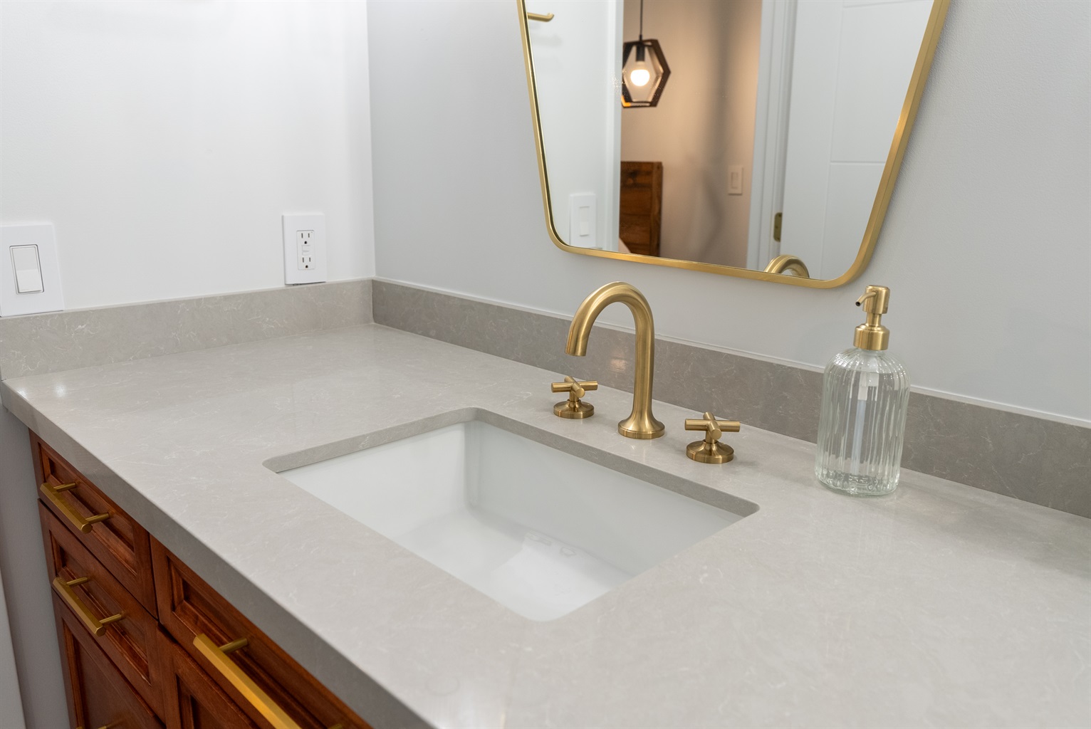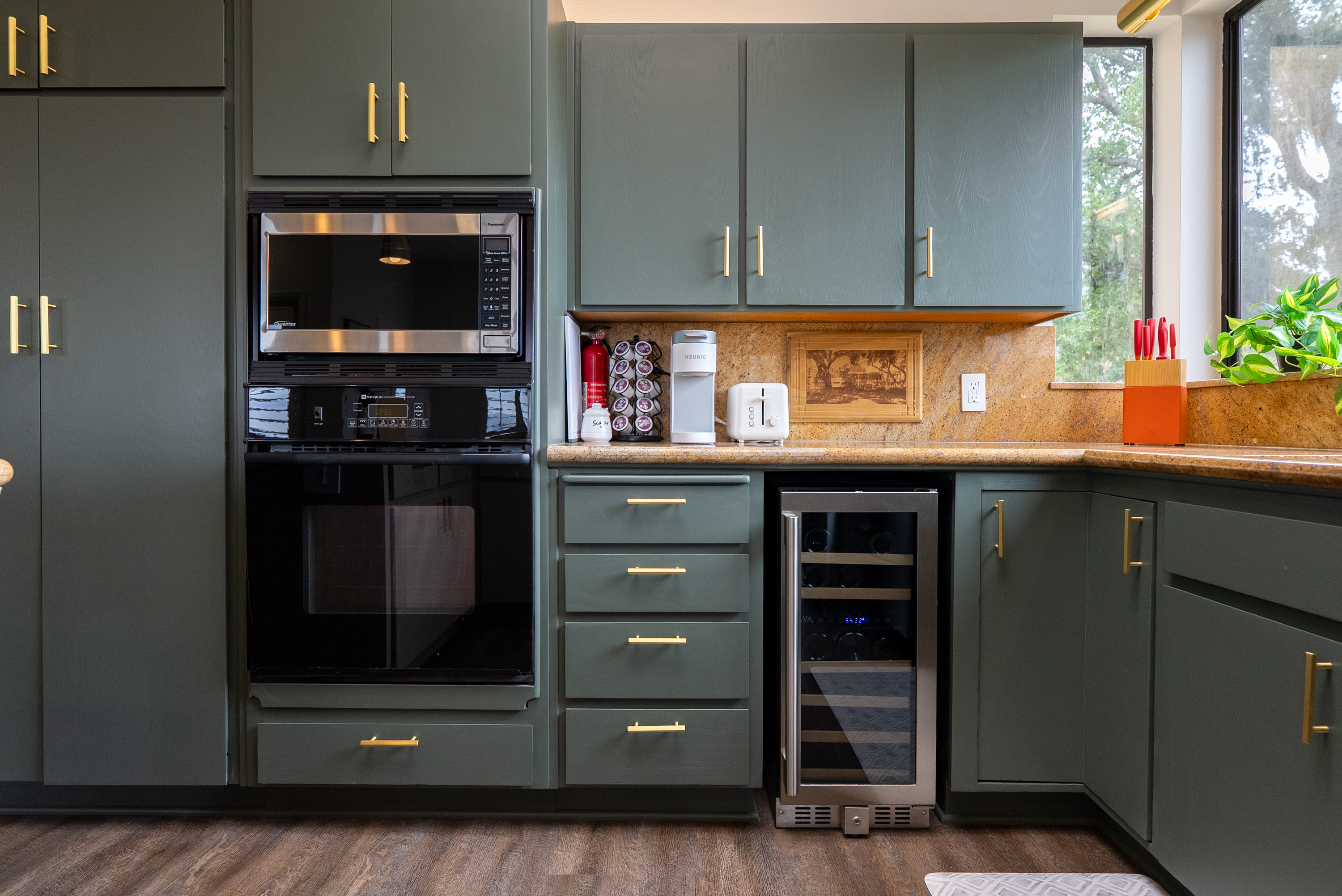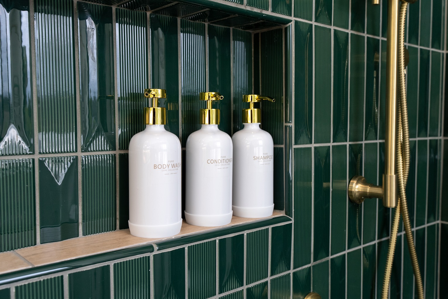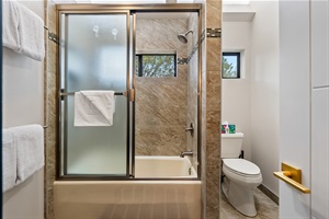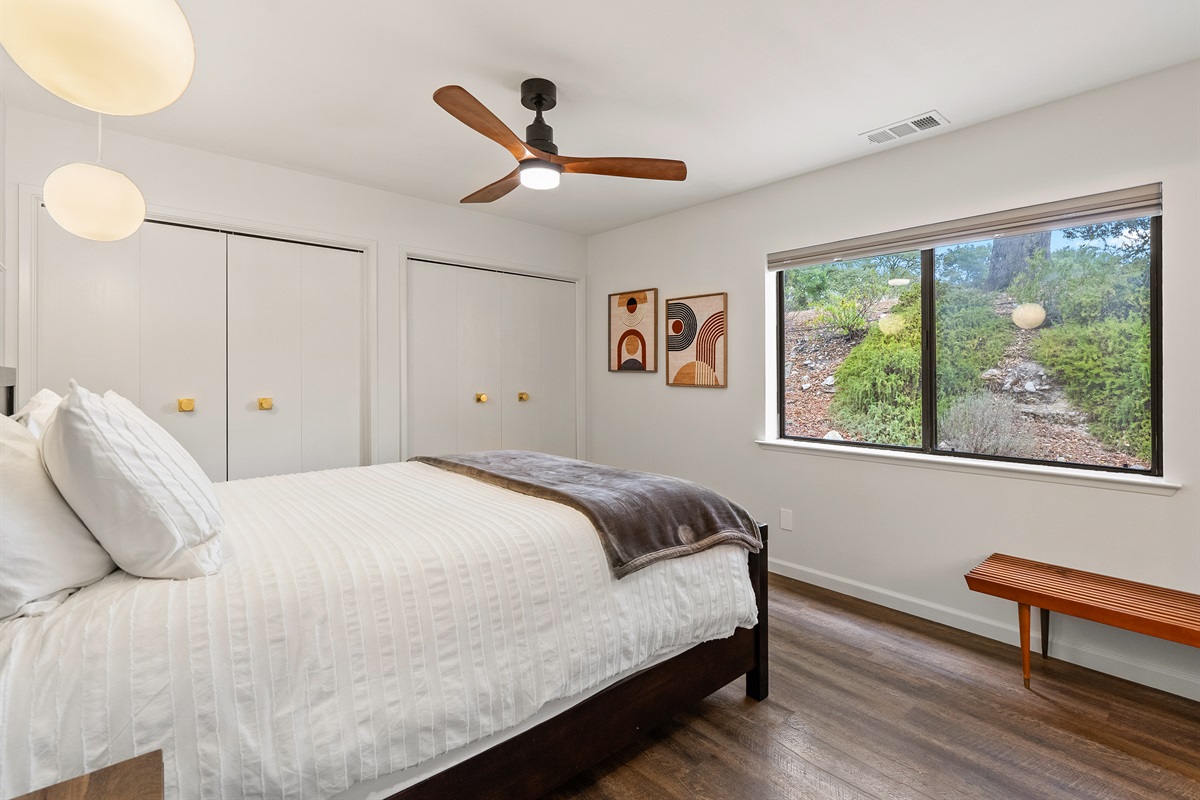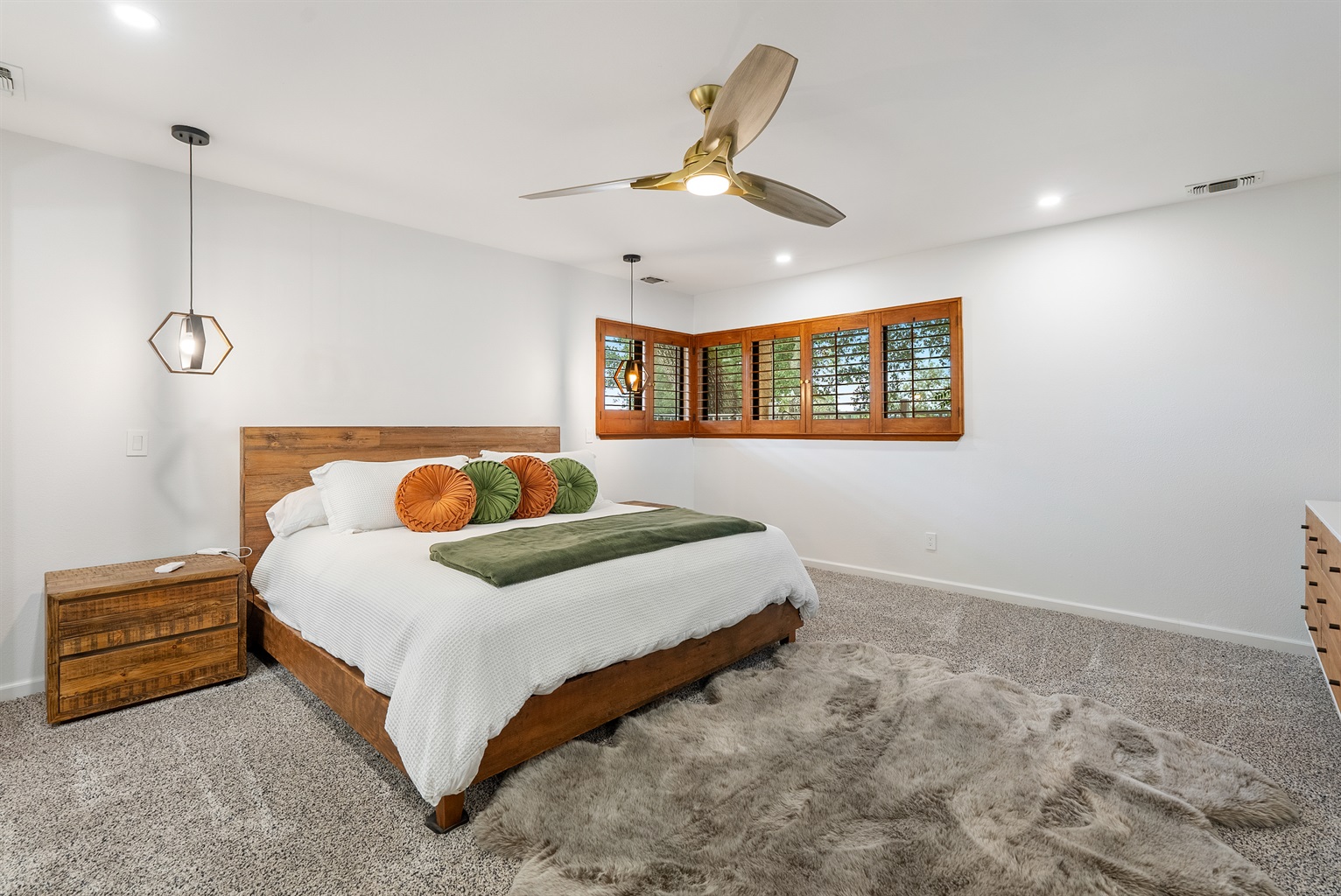 Additionally, the Green with Envy upstairs full bathroom has been completely renovated with a stunning walk-in shower. Take a refreshing shower in our “Green with Envy” space, designed to let you feel at one with the outdoors. The design perfectly complements the home's mid-century modern vibe and is conveniently located near the main living area for guest use.