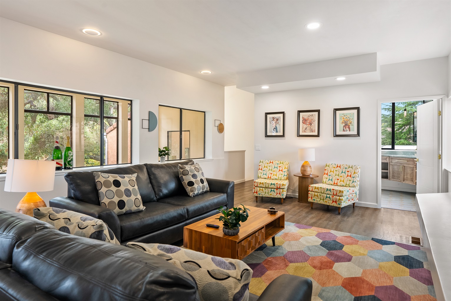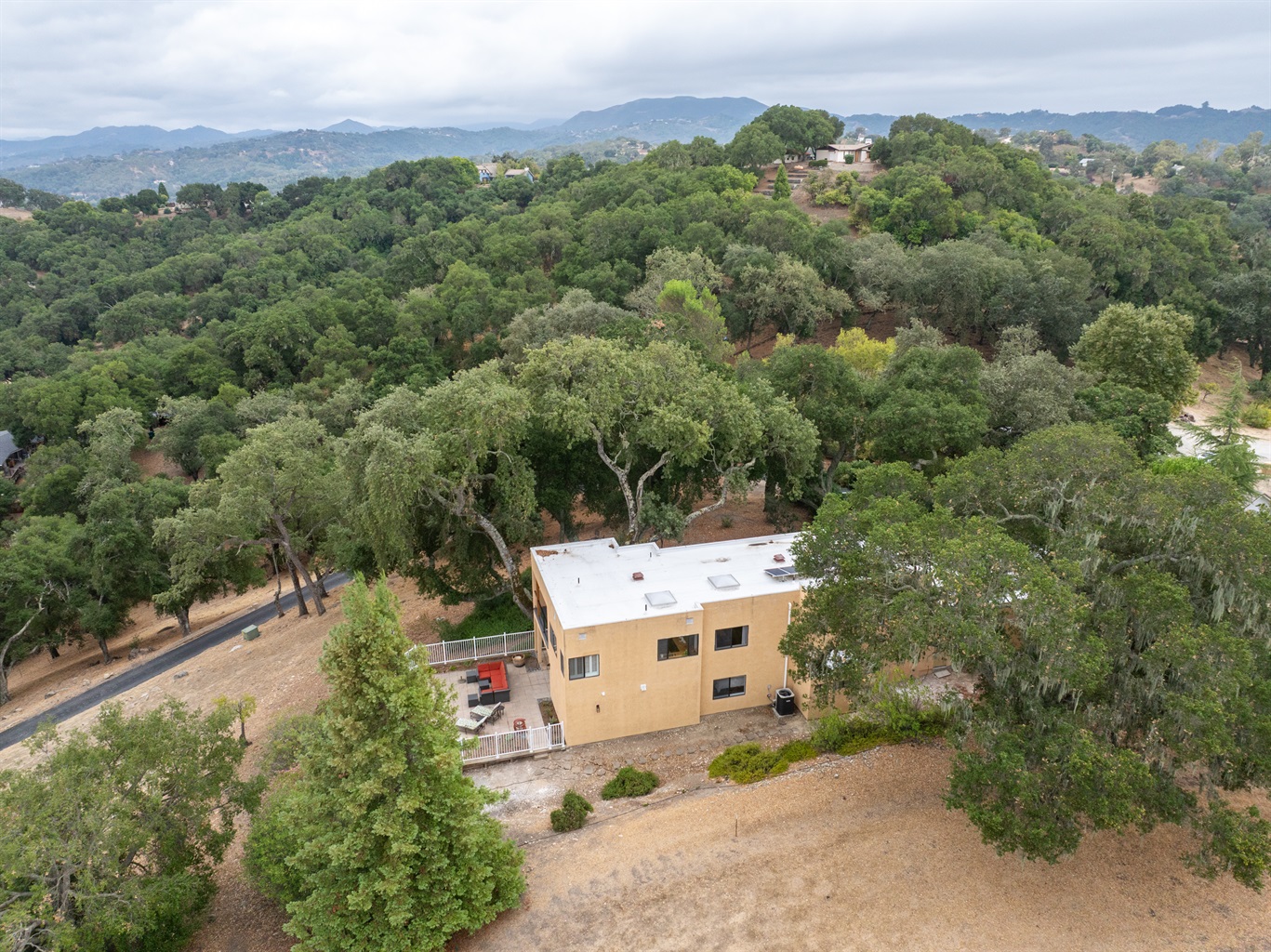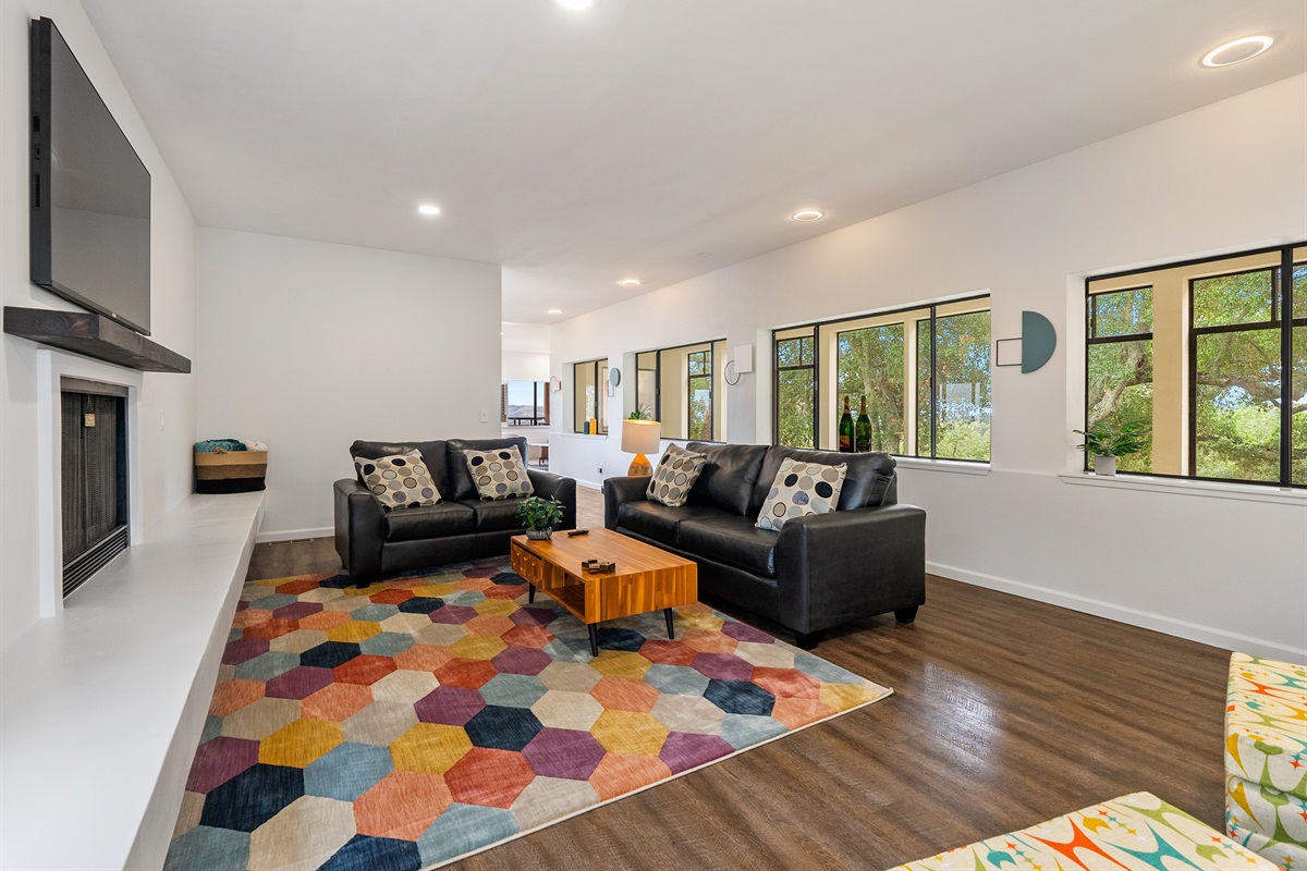 Step into a beautifully designed mid-century modern retreat that feels both timeless and tranquil. Perched on 3.3 private acres, this split-level home is filled with natural light, vaulted ceilings, and clean architectural lines that make the interior feel open and welcoming. The main living area is upstairs, where panoramic windows frame stunning views of the Central Coast hills. It’s the perfect place to gather, unwind, and soak in the peaceful surroundings.