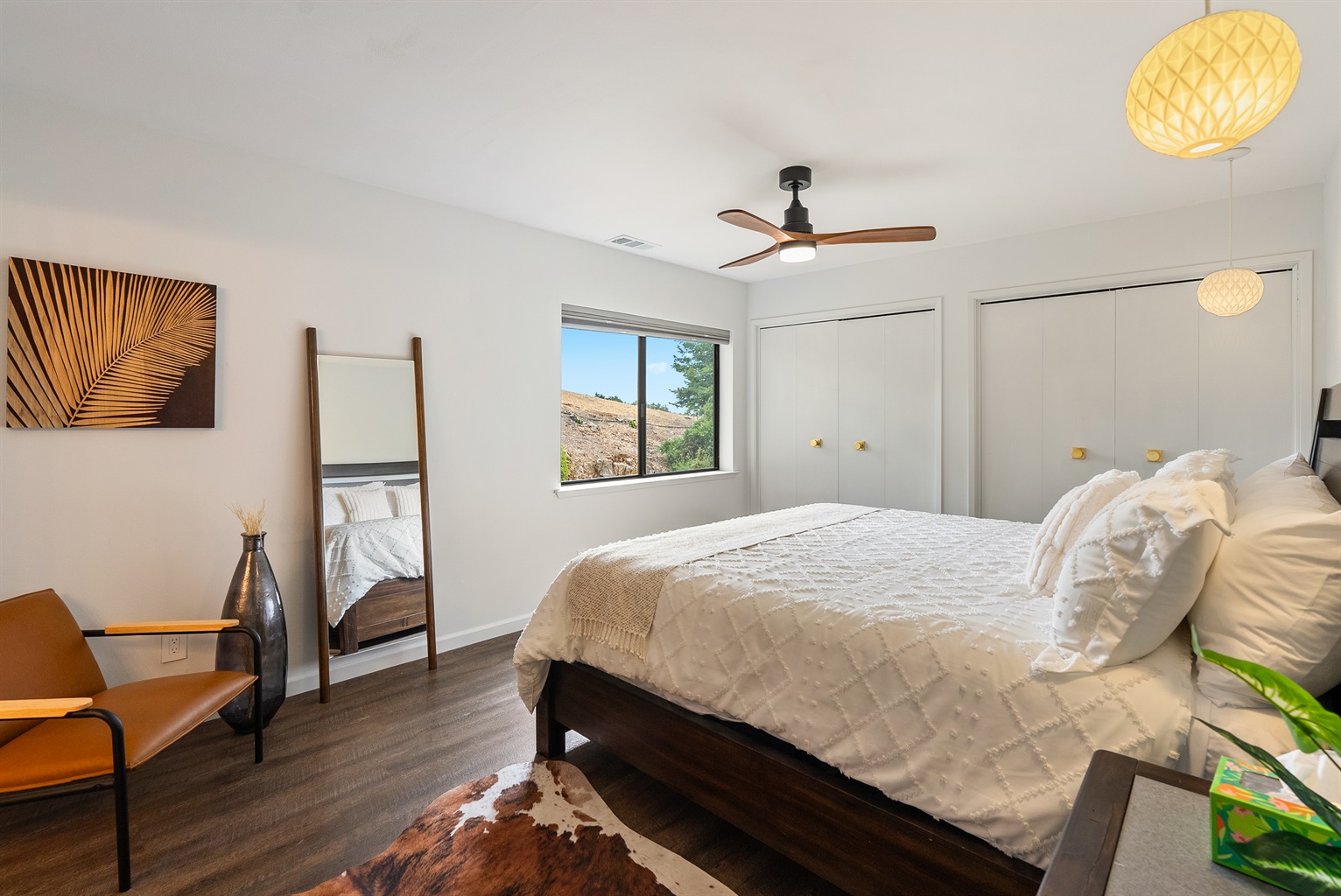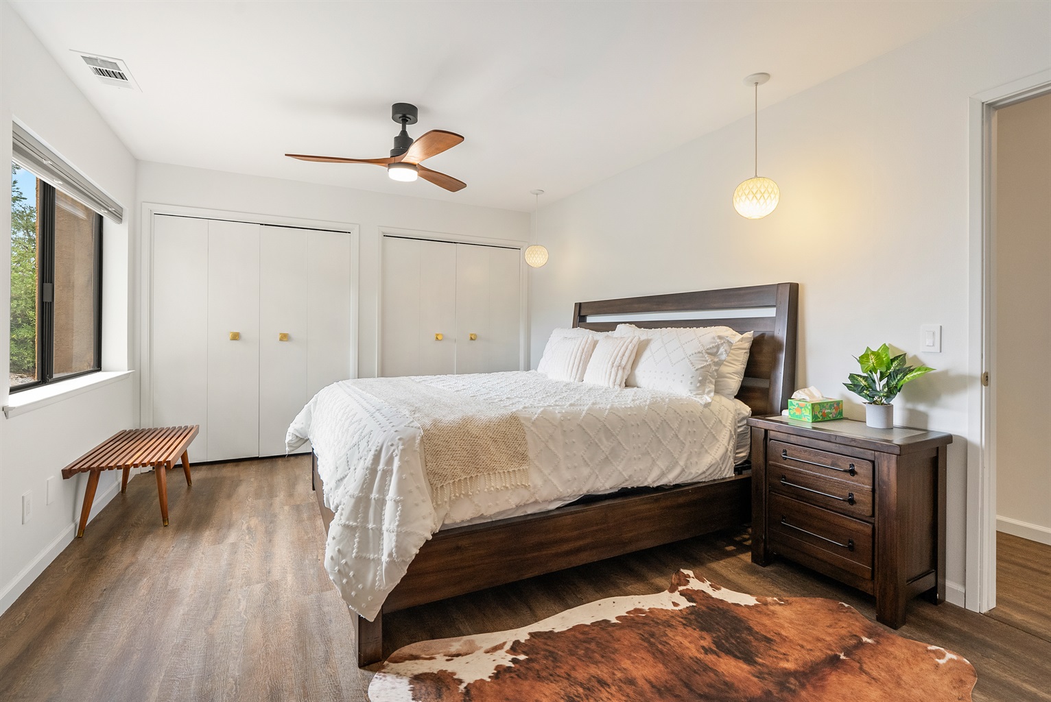 The Jetsetter’s Nest is a guest room and comes with a queen-size bed and shares the Mod Collective bathroom with The Horizon Room (Guest Bedroom 2). This room is comfortable and cozy, providing easy access to the shared bath—ideal for families or groups traveling together.