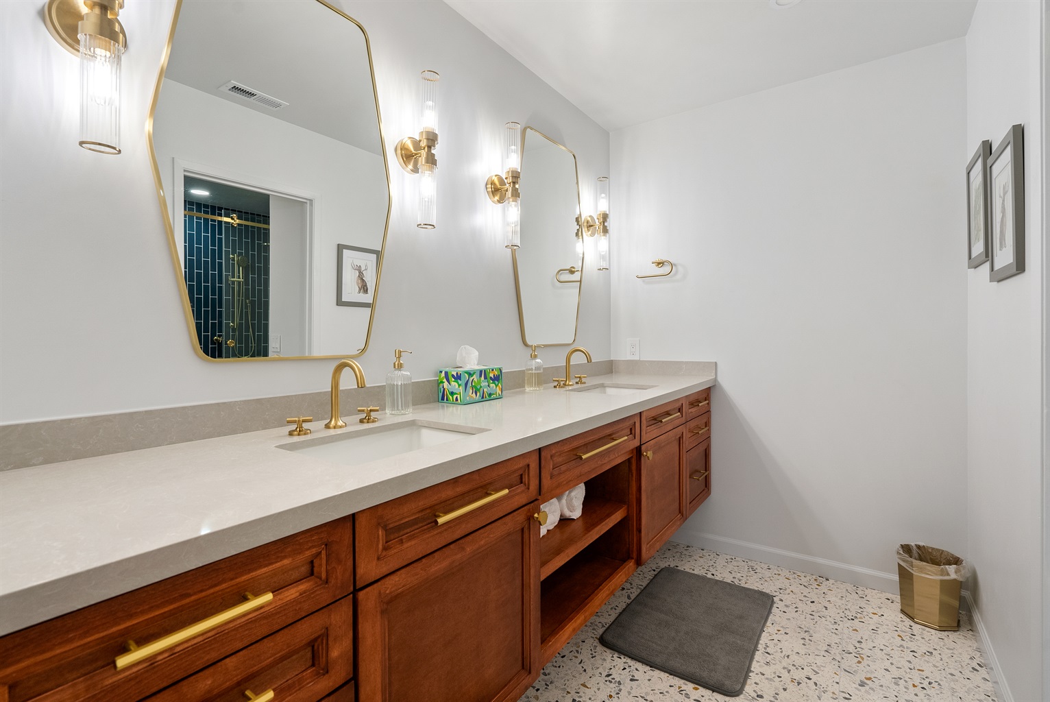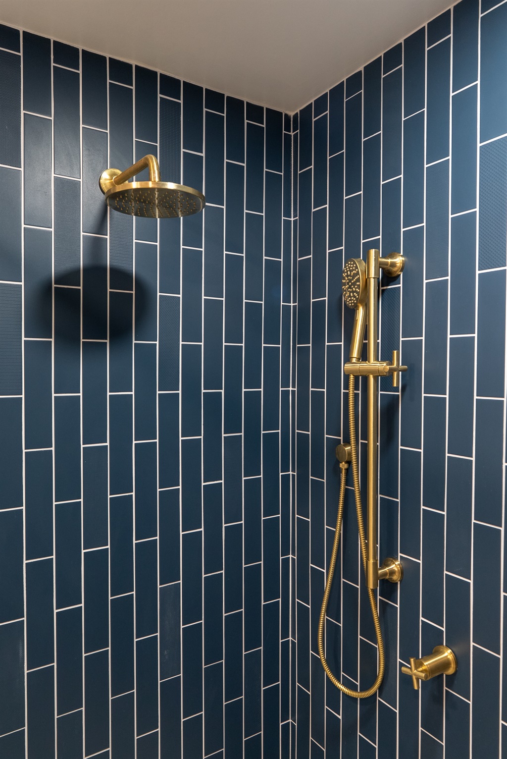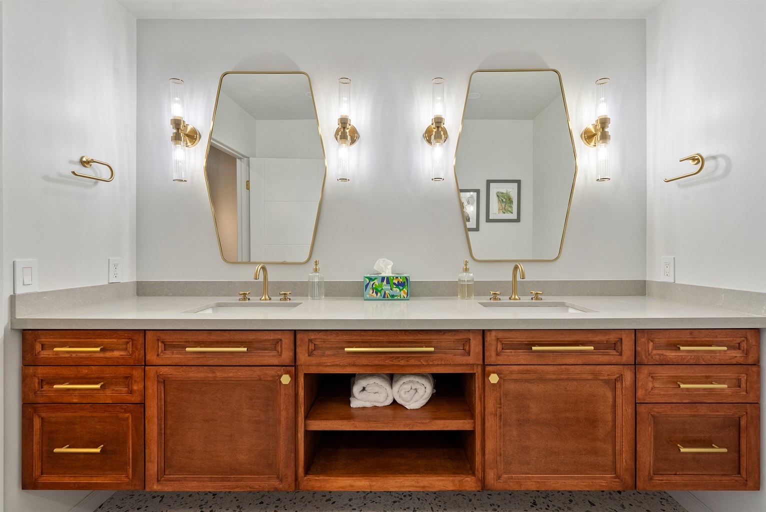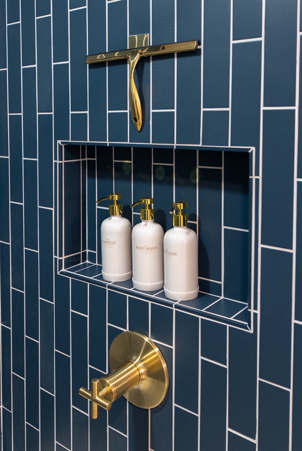 The Mod Collective bathroom, shared between The Jetsetter’s Nest and The Horizon Room, features an updated vanity and a shower/tub combo designed to offer convenience and comfort.