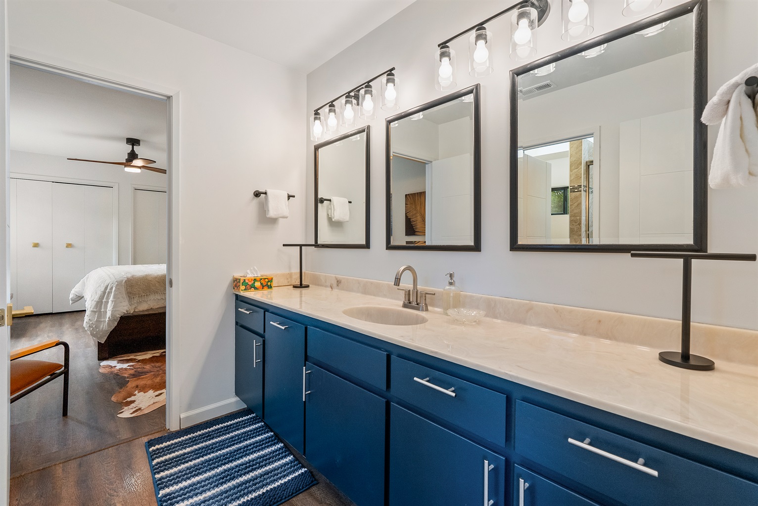 The Retro Rest is the primary ensuite that features a king-size bed and has been completely updated with modern finishes. It offers a spacious layout with direct access to a recently renovated en-suite bathroom, Mid Century Blue, which includes spa-inspired features such as a walk-in shower, sleek vanity, and a serene ambiance designed for relaxation.