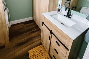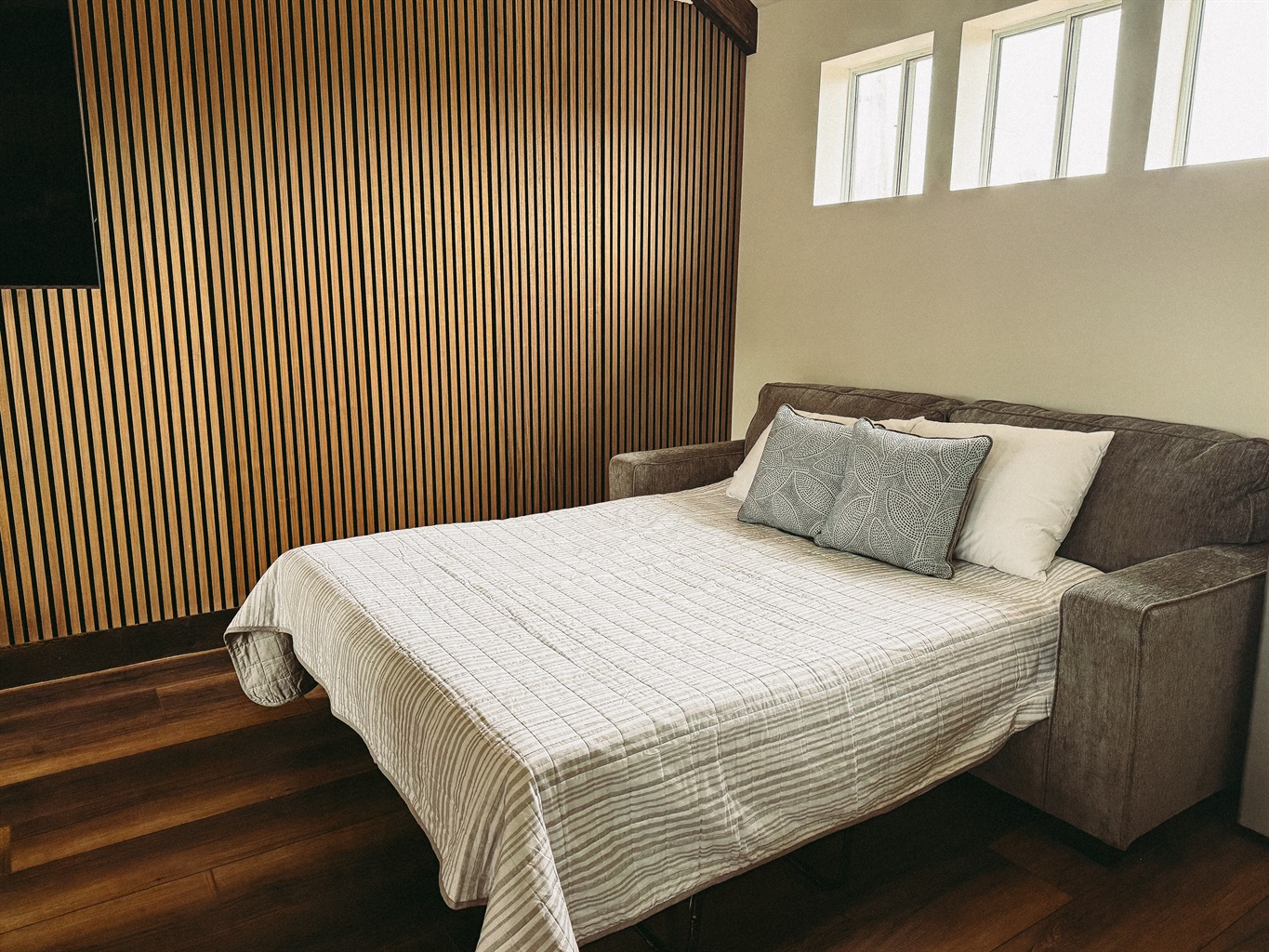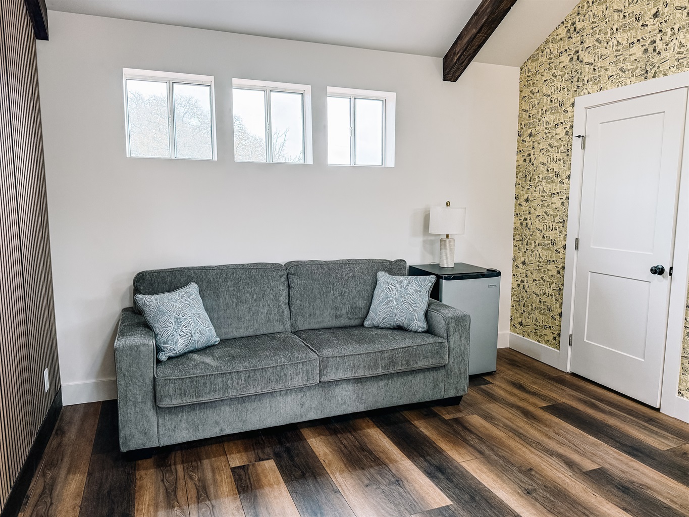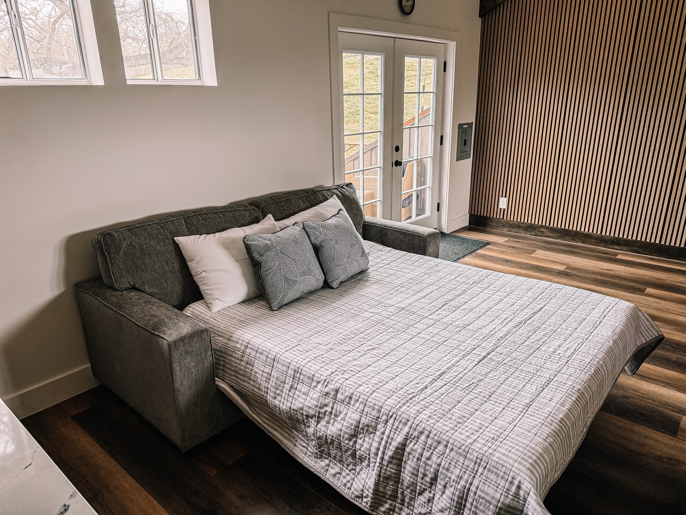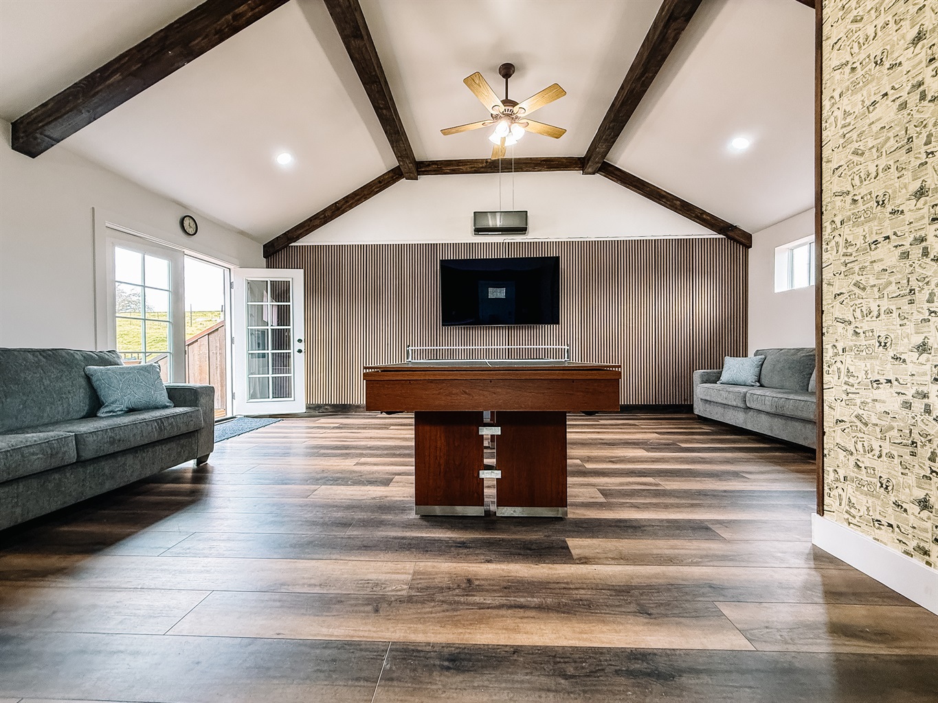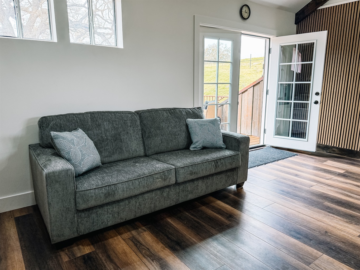 Need extra space? This separate barn loft offers a fun bonus area with a ping pong/pool table, half bath, washer/dryer, plus AC and heat for year-round comfort. Two pull-out couches provide flexible sleeping or lounging. Enjoy the patio with views of the iconic oak tree, then relax in the laid-back barn setting. Note: Separate from the main home, no shower (use main house), and stairs are required.