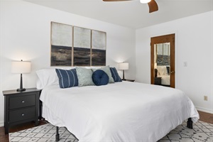 Sleep: The home accommodates up to six guests with three beautifully designed bedrooms, each outfitted with premium bedding and soft linens for restful nights. The primary bedroom features a king-size bed, an en suite full bath with tile walk-in shower, and a flat screen TV (streaming services only, no cable). Guest bedroom #1 has a queen-size bed. Guest bedroom #2 has a comfortable full-size futon bed and a work station with a desk, office chair, and monitor. The guest's full bathroom features a tub/shower combo.