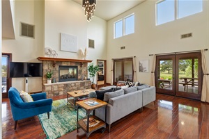 Indoor Comfort: Cathedral-ceiling living area stocked with books, games, guides, central climate control, high-speed Wi-Fi, and Smart TV entertainment creates a seamless blend of comfort and connectivity for every guest.