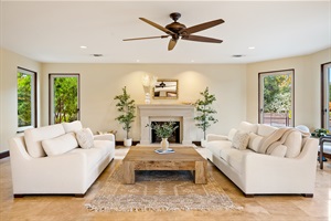 Gather & Relax: The great room showcases floor-to-ceiling windows overlooking the pool and gardens, plush sofas, and a piano for impromptu entertainment. A second-floor entertainment loft features a Smart TV with Roku for movie nights.